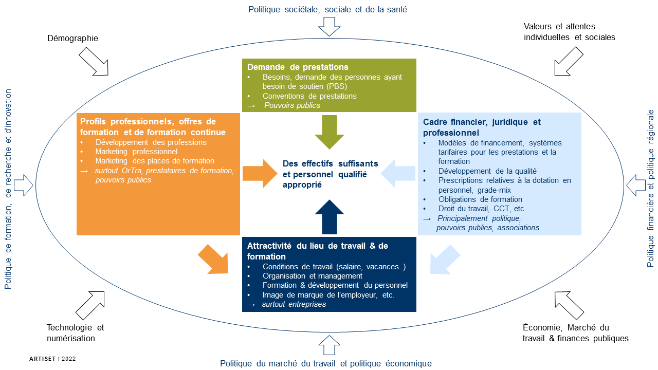 De multiples facteurs influencent et déterminent la situation sur le marché du travail. ARTISET et ses associations de branche CURAVIVA, INSOS et YOUVITA agissent de manière ciblée aux niveaux institutionnel et politique sur les facteurs à modifier face à la pénurie de personnel qualifié.